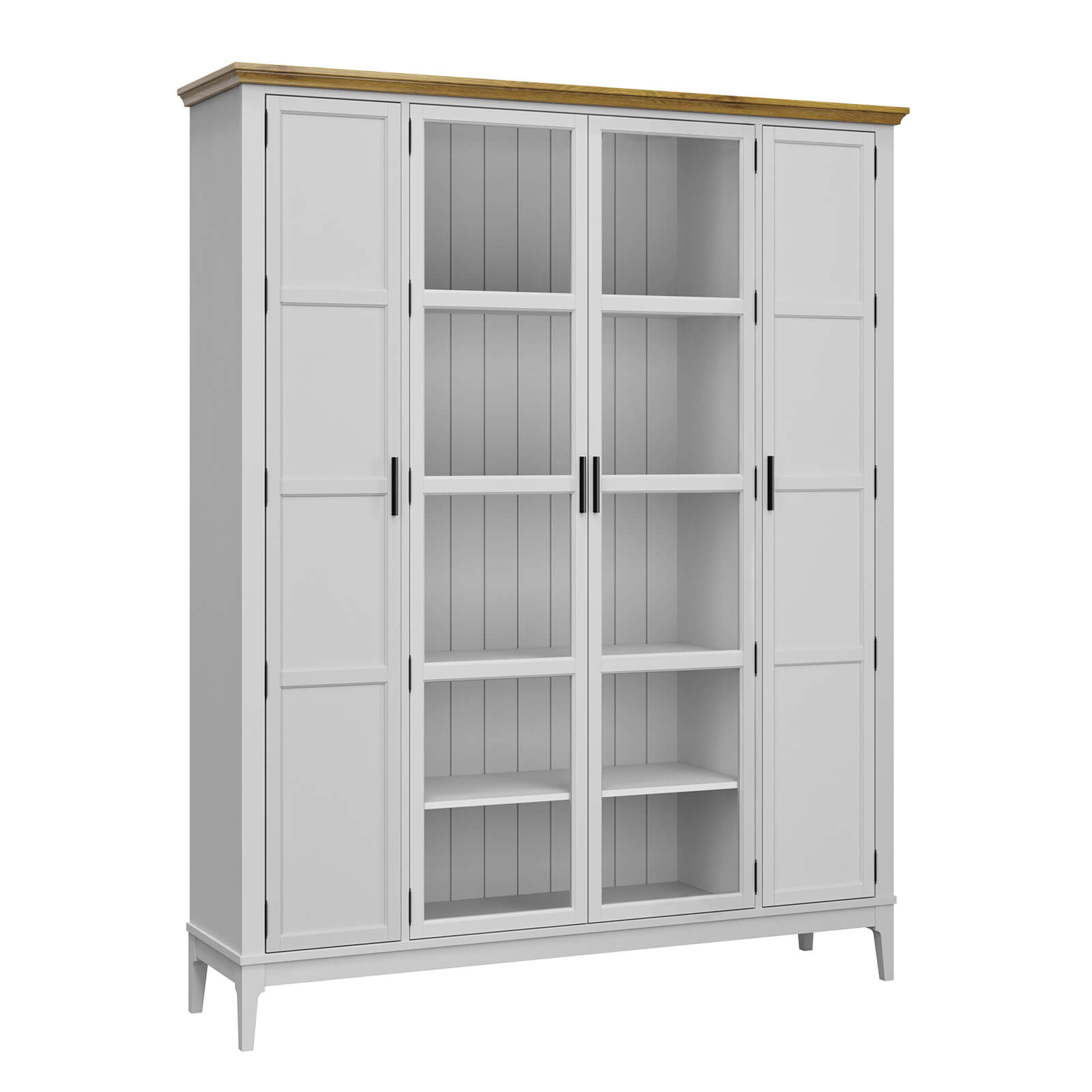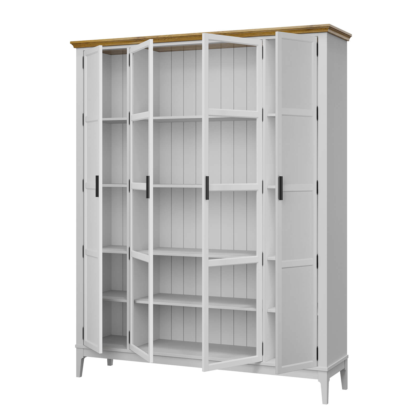 Представляем шкаф для книг из массива сосны. Представляет собой высокий шкаф с распашными, стеклянными дверями, дверями филенкой, четырьмя широкими полками и восемью узкими.