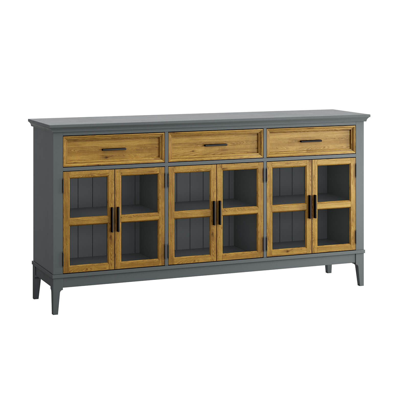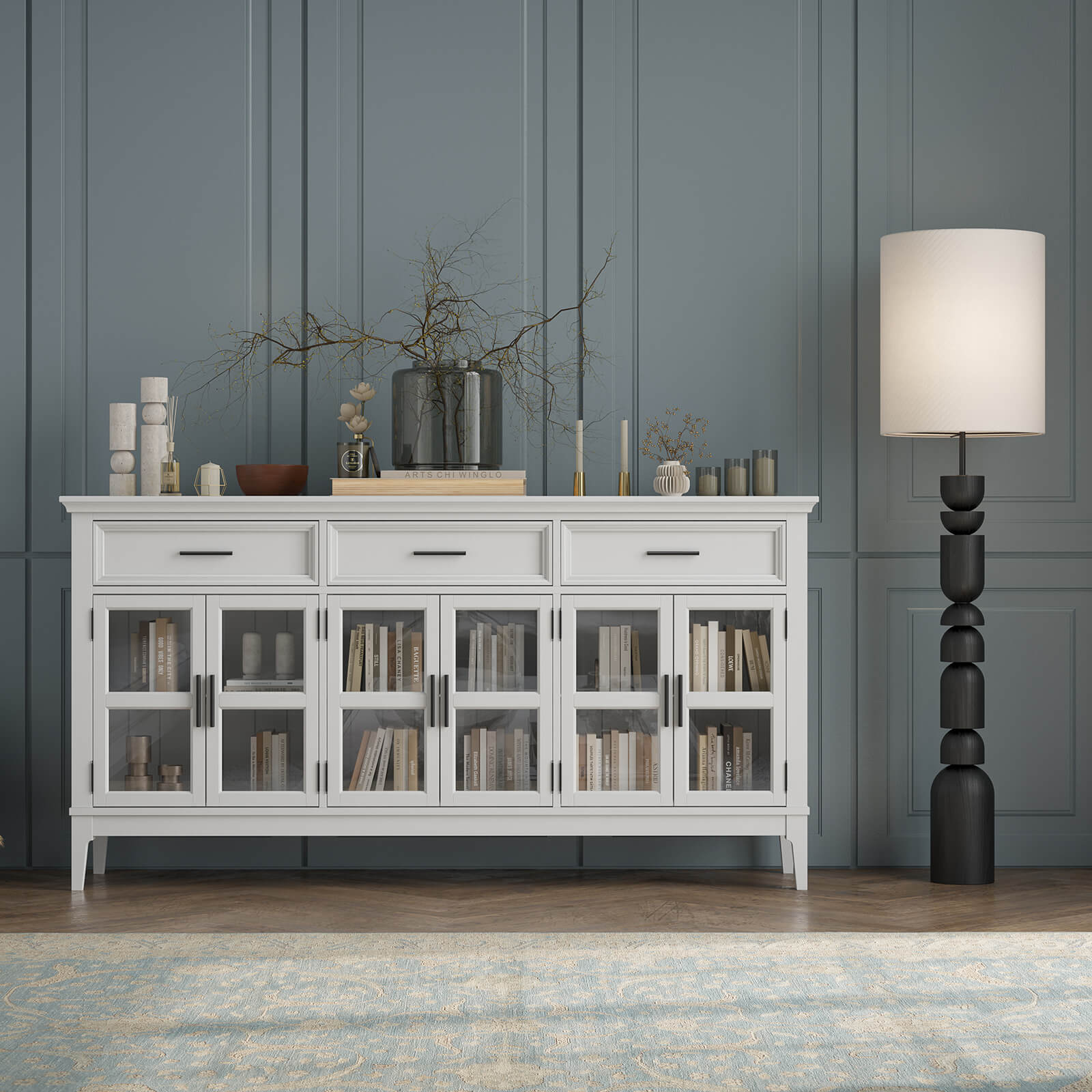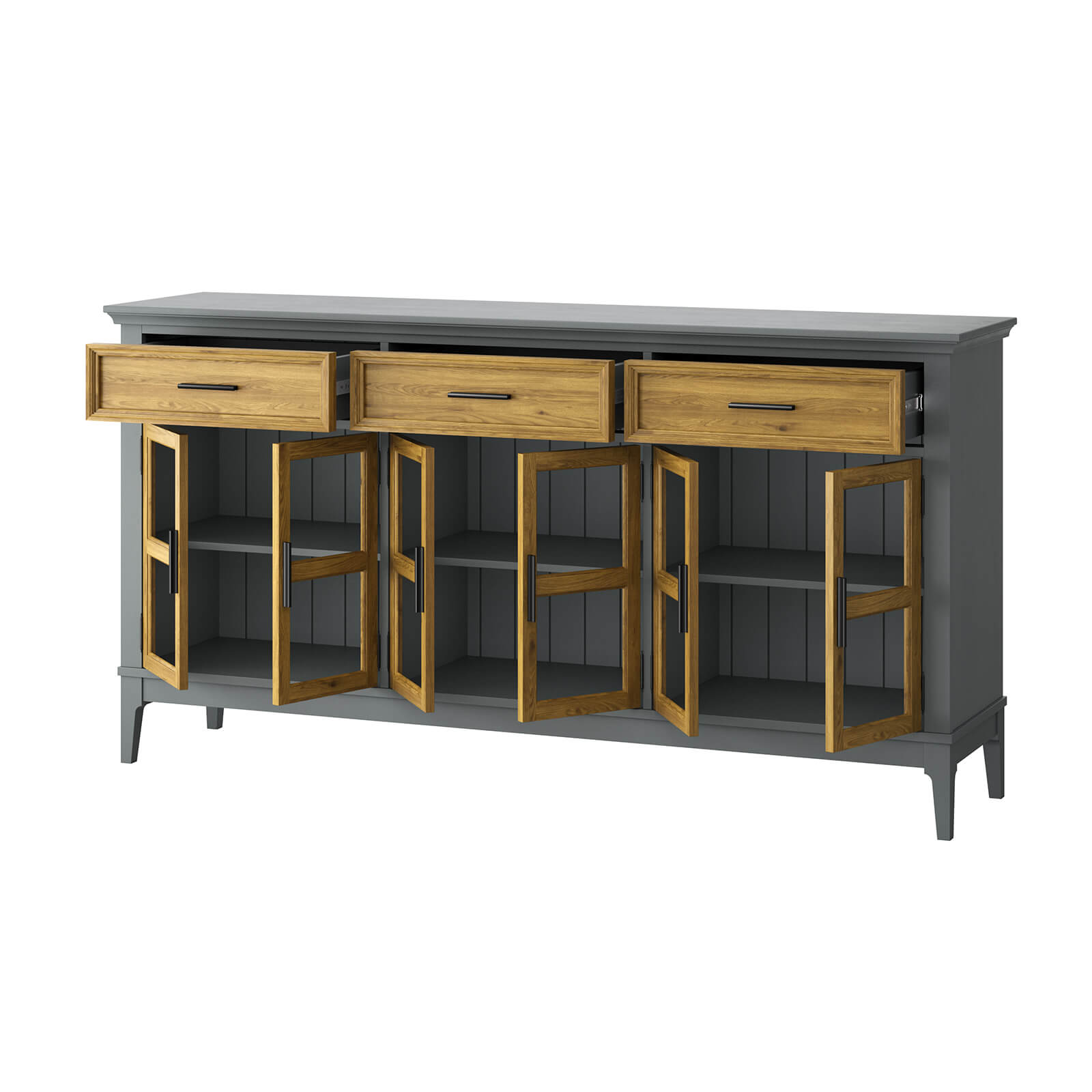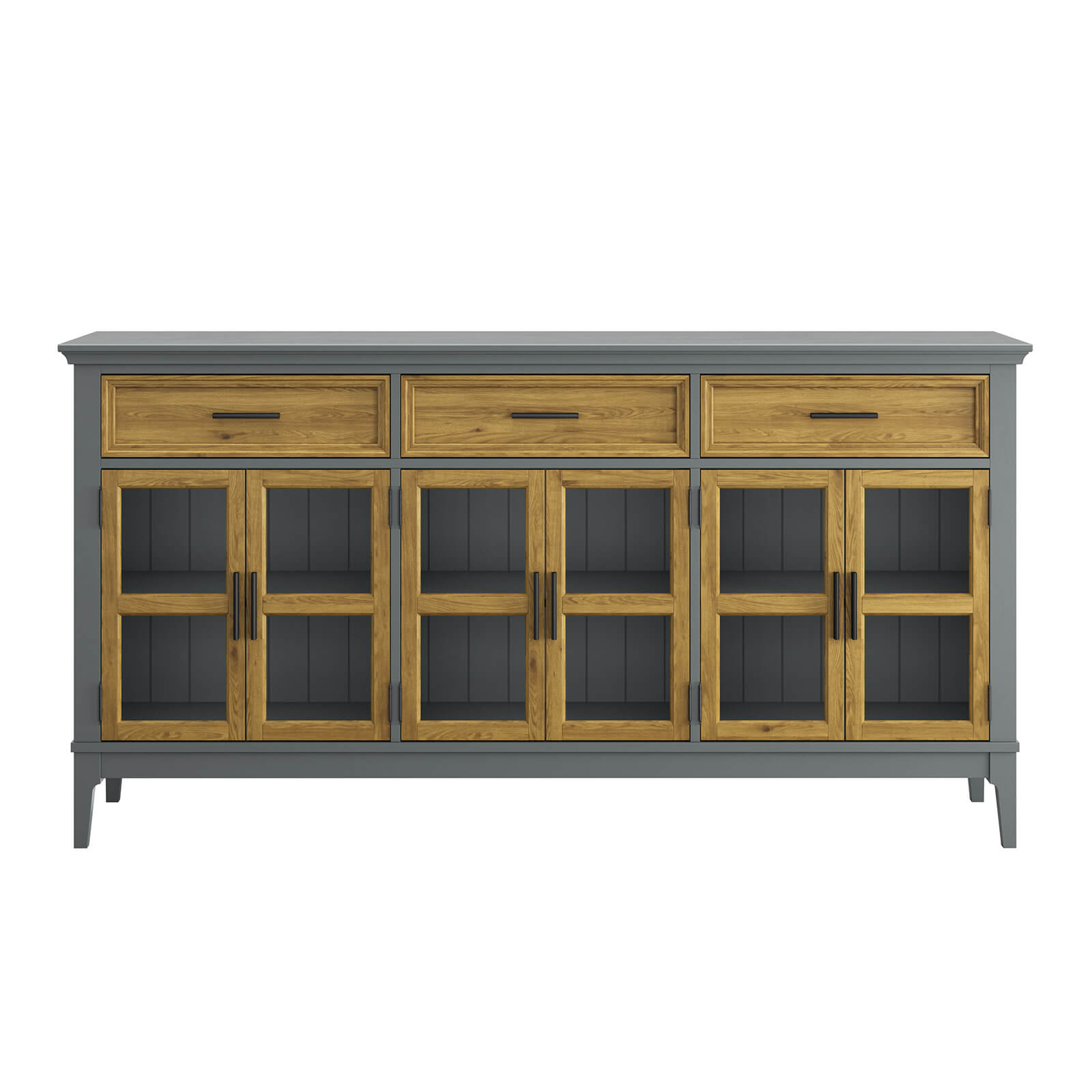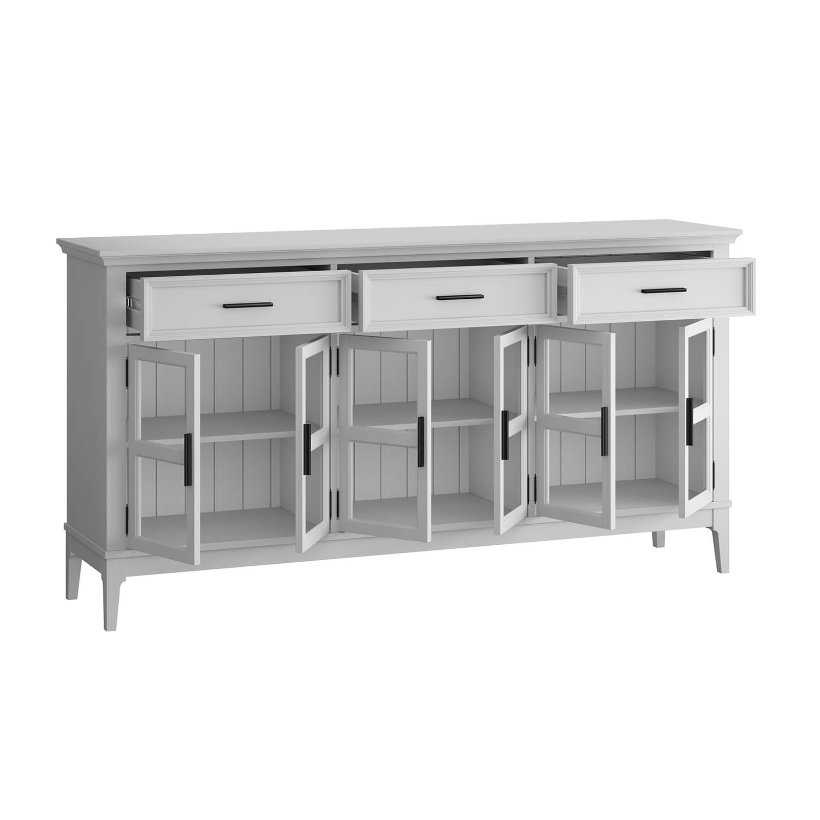 Тумба «Квадро-С» 063С широкая и удобная. Состоит из трех вместительных отделений с полками за распашными, стеклянными дверками, сверху три выдвижных ящика. Подойдет как для прихожей, спальни или гостиной в городской квартире, так и для загородного дома.