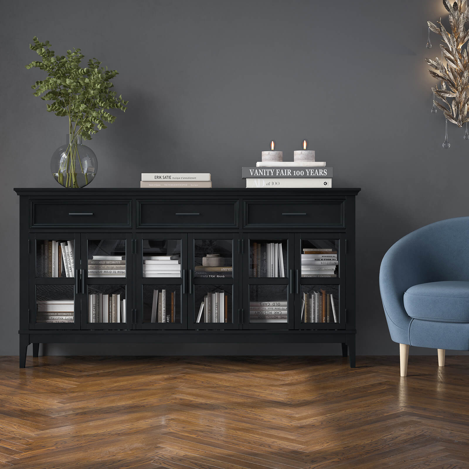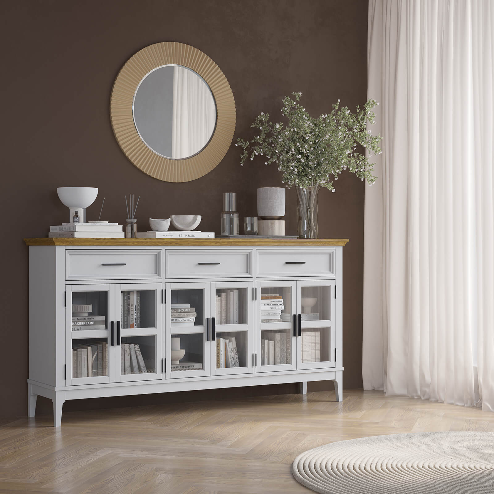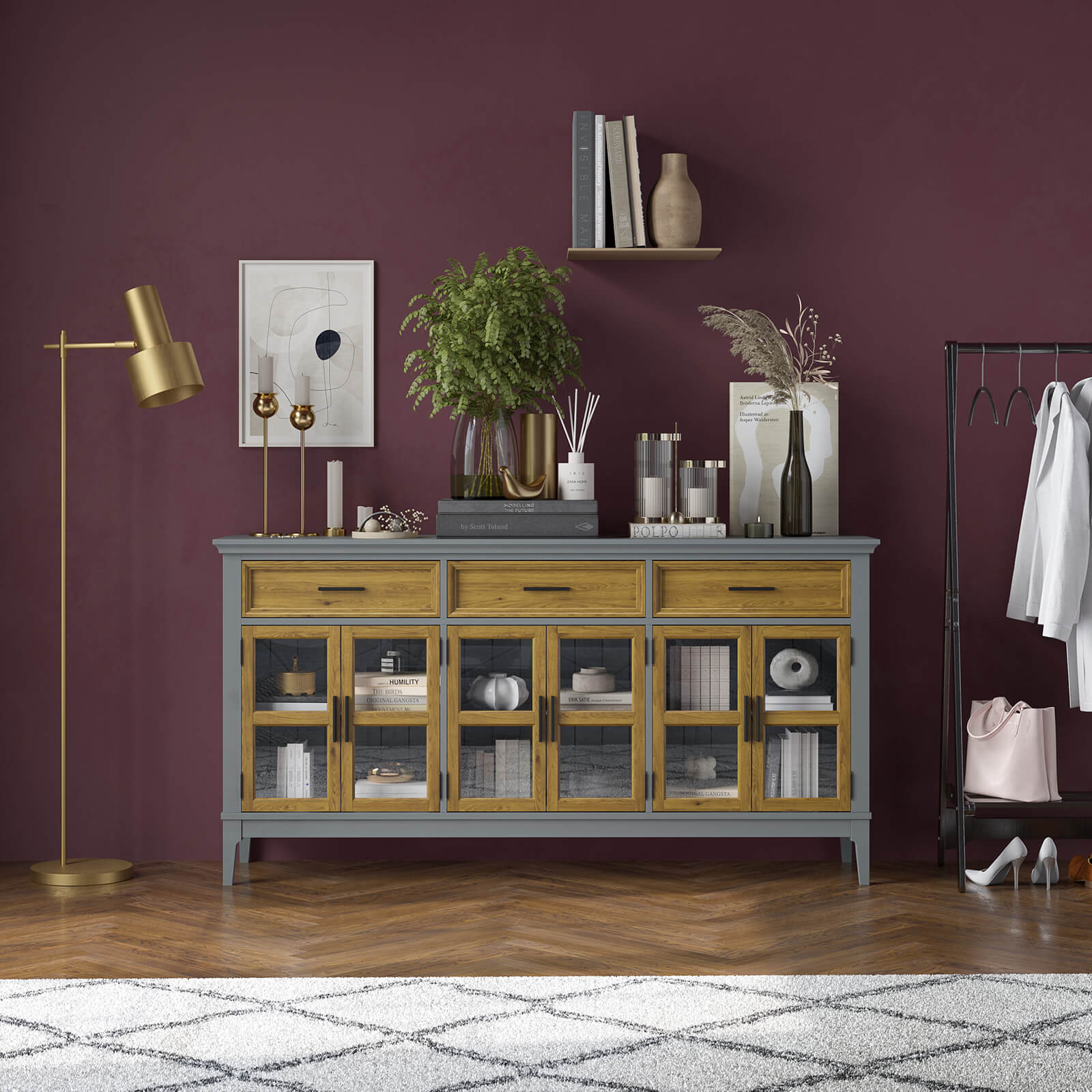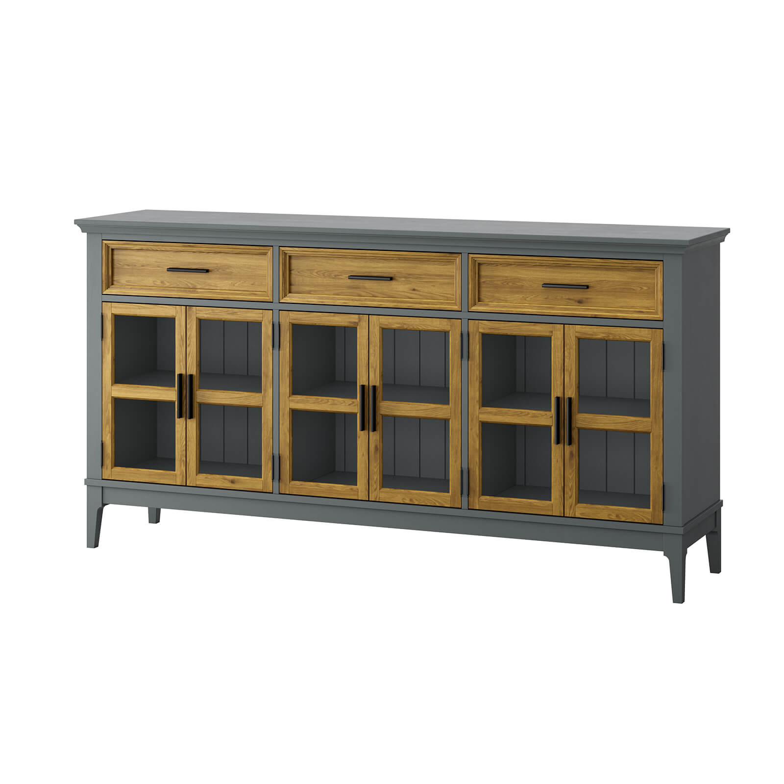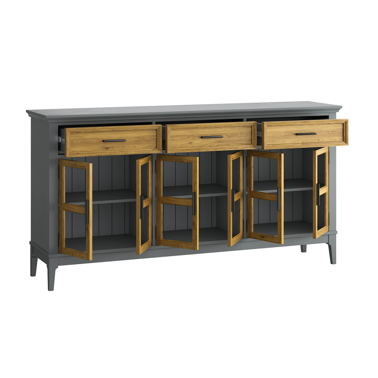 Тумба «Квадро-С» 063С широкая и удобная. Состоит из трех вместительных отделений с полками за распашными, стеклянными дверками, сверху три выдвижных ящика. Подойдет как для прихожей, спальни или гостиной в городской квартире, так и для загородного дома.