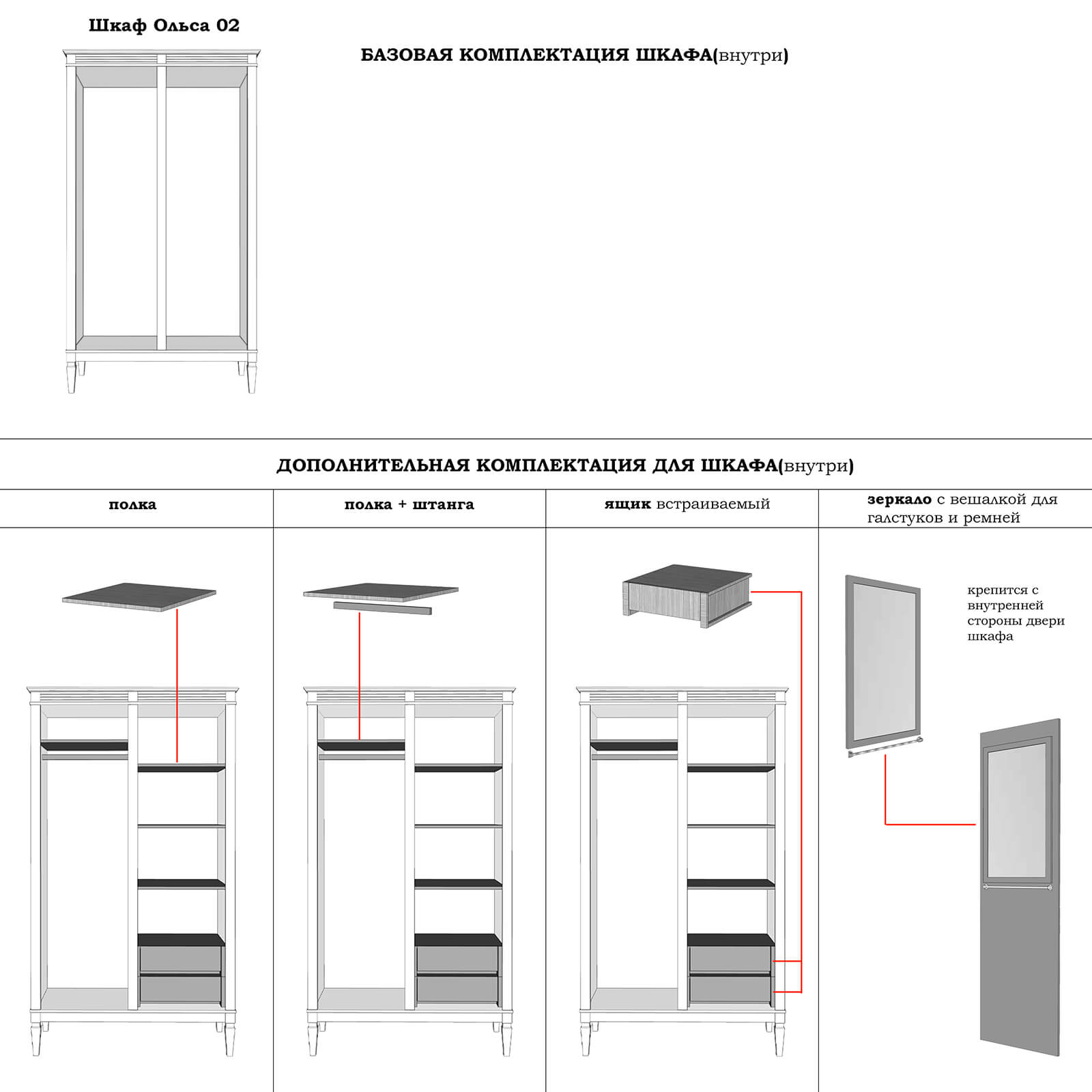 • В базовое наполнение шкафа полки и штанги НЕ ВХОДЯТ;